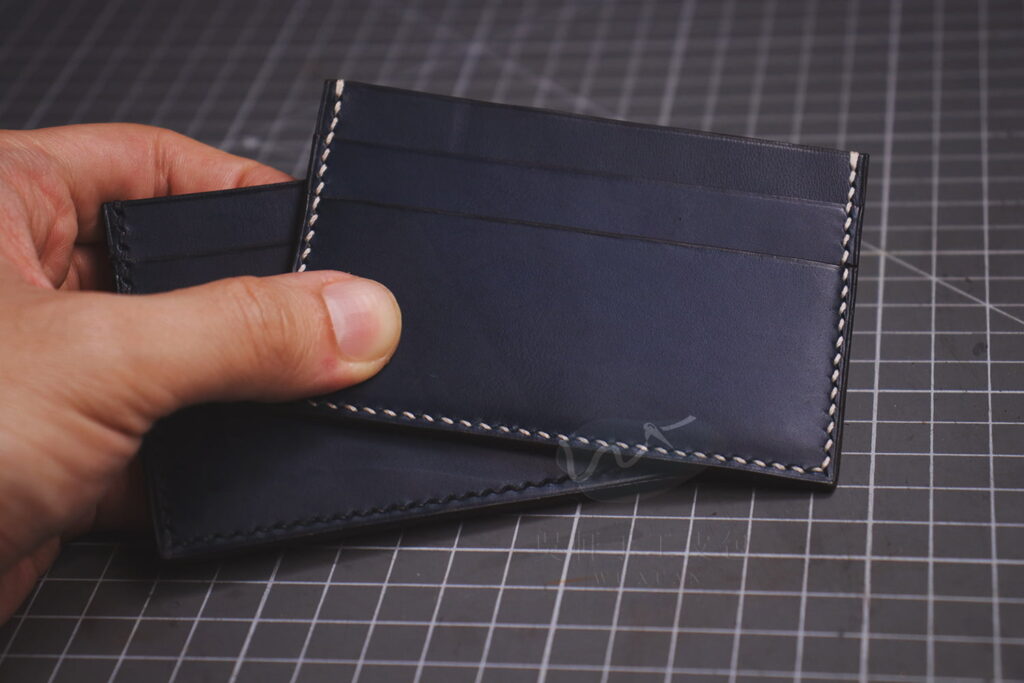 如此一來,製作時縫線較不易與皮革纖維過度摩擦,能更加順暢穿過斬孔、並保護縫線;並且外層由於有了蠟的覆蓋,也較不容易在使用過程中分岔、起毛球,間接增加了縫線的耐久度。