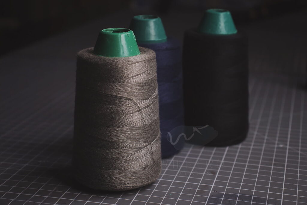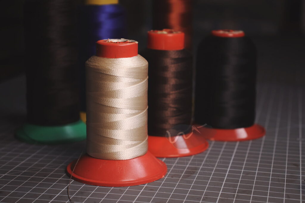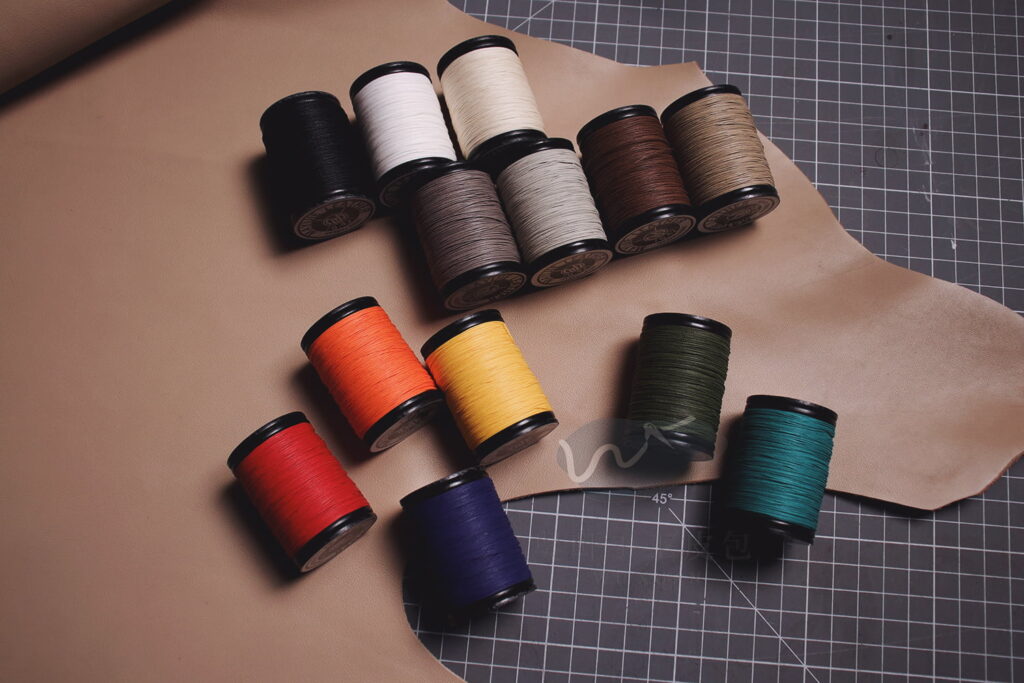 尼龍線是皮革車縫時的主流選擇,市面上大多數的皮包,都是以尼龍線車縫而成。它的色彩飽和、光澤對比高,所以跟皮面搭配時,會有比較強的對比效果。