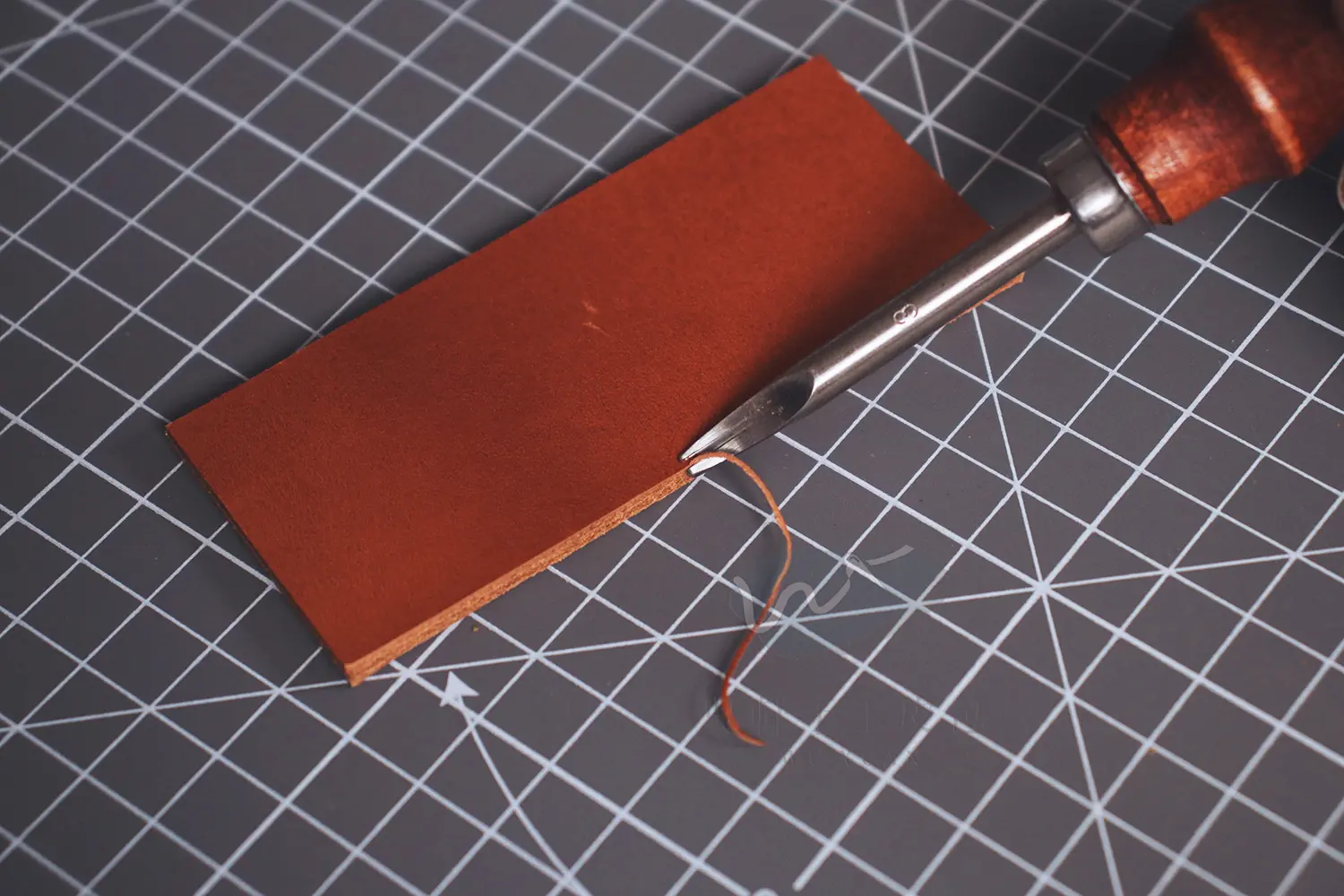 如上圖所示,導角器可以將皮革邊緣的直角削圓,更容易塑形成圓弧形的狀態。