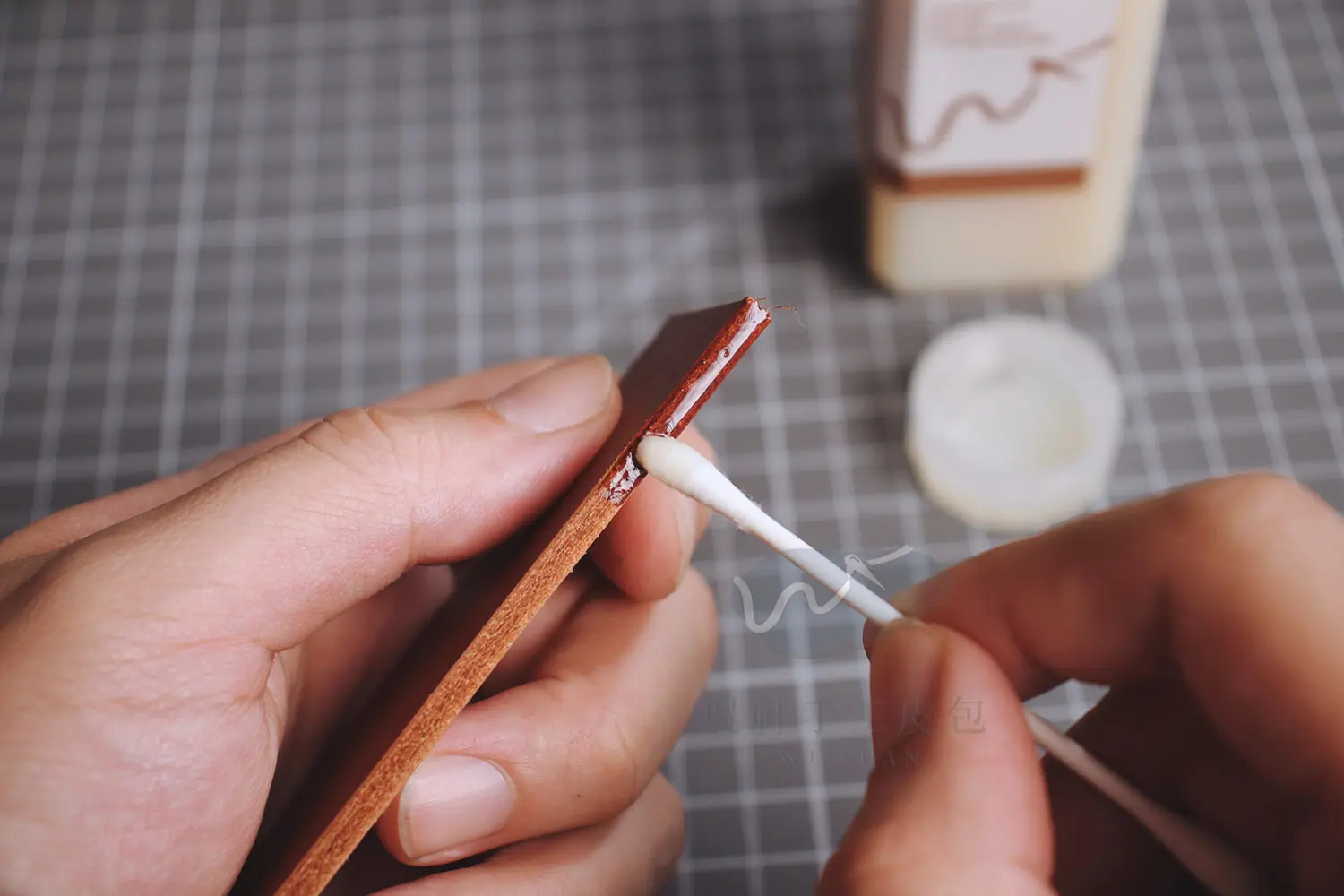 將封邊液倒出,再以棉花棒沾取,塗抹至皮革邊緣。