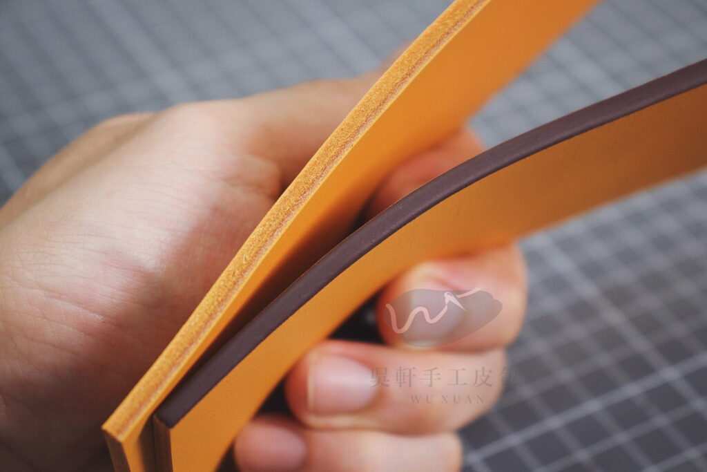 例如:植鞣磨邊,如果沒有使用含樹脂的封邊液,使用久了兩層皮革可能會有分離、開裂的情況。
