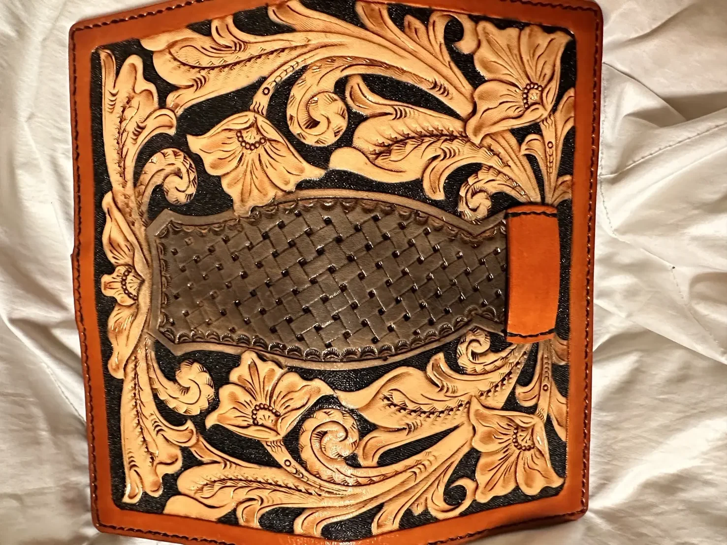 下圖是一款植鞣、皮雕、染色、手縫等元素組成的工藝作品,是不是與名牌包的風格完全不同呢?